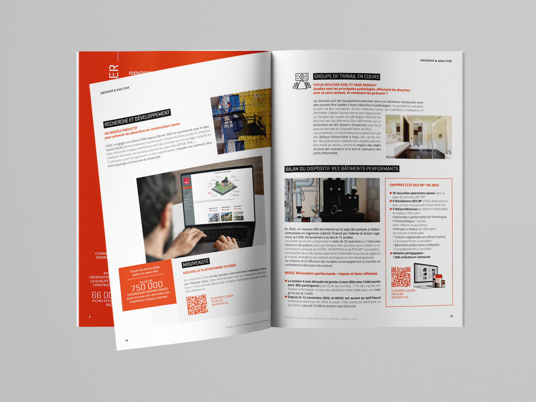 Depuis 2023, l'AQC me confie la mise en page de ses rapports annuels. Je travaille avec eux avec beaucoup d'autonomie au service de leur mission d'intérêt général : prévenir les désordres et améliorer la qualité de la construction en proposant des outils et des solutions aux professionnels du bâtiment. L'usage du document est mixte : impression et numérique, il est interactif, avec des zones cliquables ou des QR code flashables.
