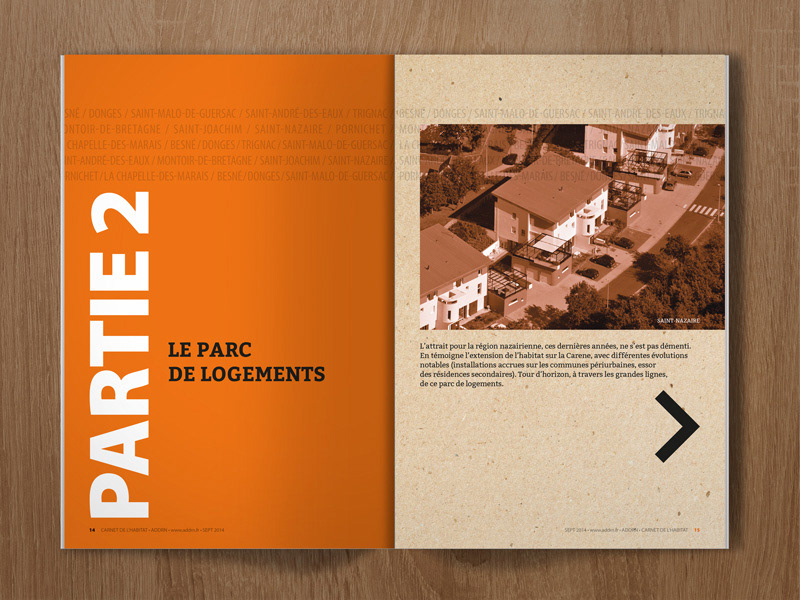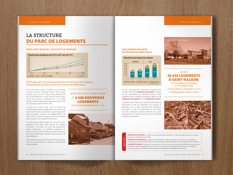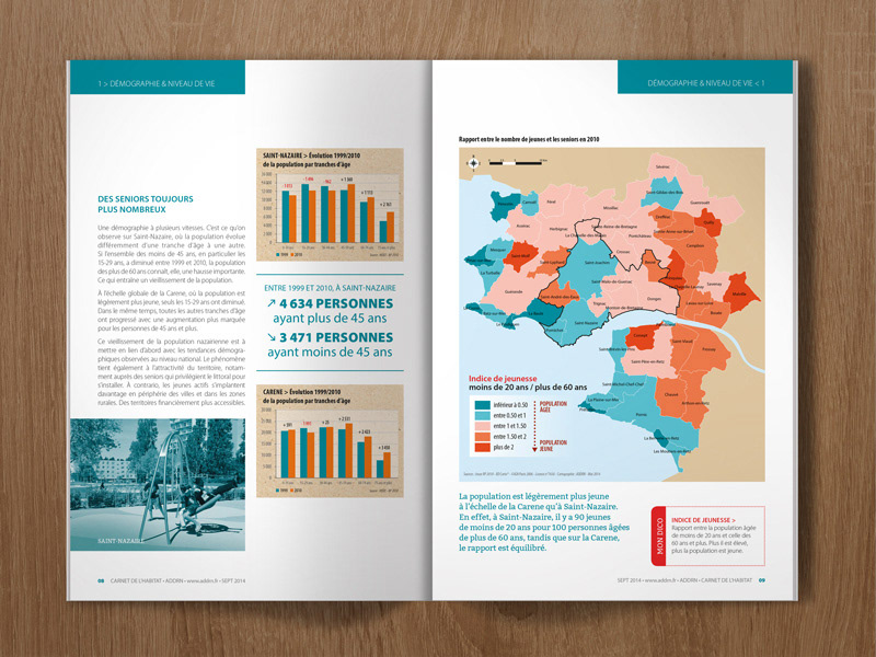 Création d’un outil de communication avec les attributs d’un carnet pérenne. Organisation avec un système de rubricage, des codes couleur forts pour un repérage aisé. Création de zooms et de différents niveaux de lecture pour rythmer la lecture, mettre en valeur les informations clés et permettre une lecture en diagonale des informations. Travail sur les graphiques, tableaux, cartes de manière attrayante et colorée. Traité des photos en bichromie pour laisser la première place aux informations.
