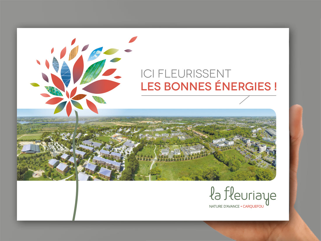 Un logo en rondeur, minimaliste, très végétal, évoquant le lien. Un motif récurrent sous forme de fleur qui donne une énergie créative. Un panoramique avec incrustation des projets immobiliers. Un ensemble frais, vivant, chaleureux, simple.