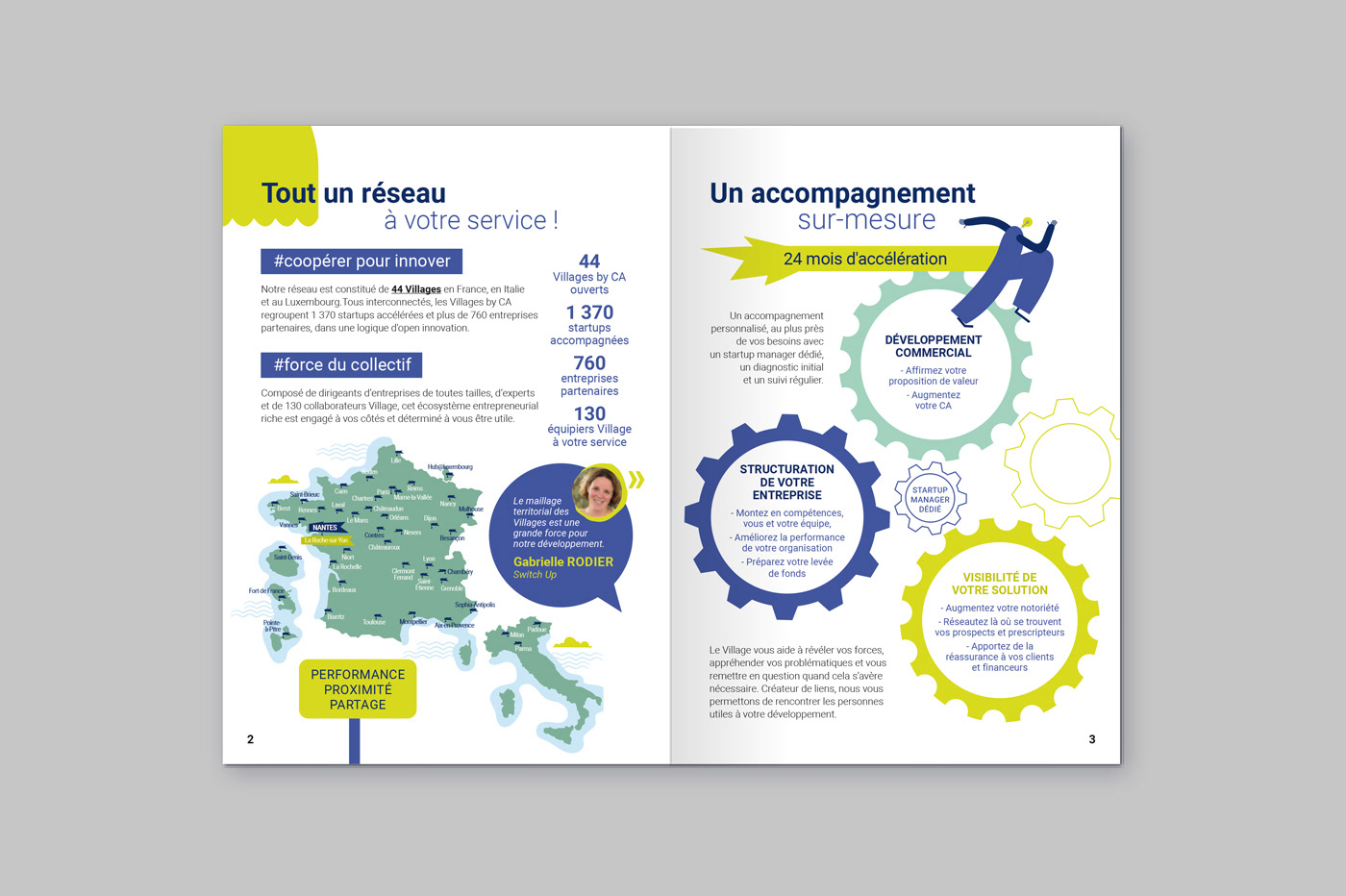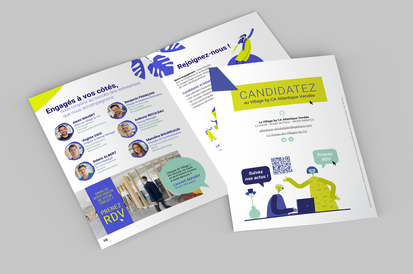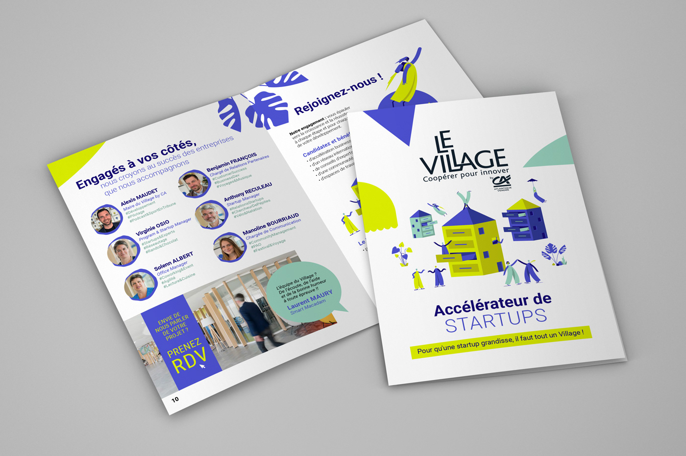 Le Village by CA Loire-Atlantique Vendée, situé au siège régional du Crédit Agricole à Nantes, m'a missionné pour la création graphique d'un livret à destination des futures startups souhaitant être accélérées et se développer. Un document vivant, pratique et interactif pour une inscription en ligne facilitée. Un guide accessible, ludique, en accord avec les valeurs de coopération et d'innovation du Village by CA Atlantique-Vendée.